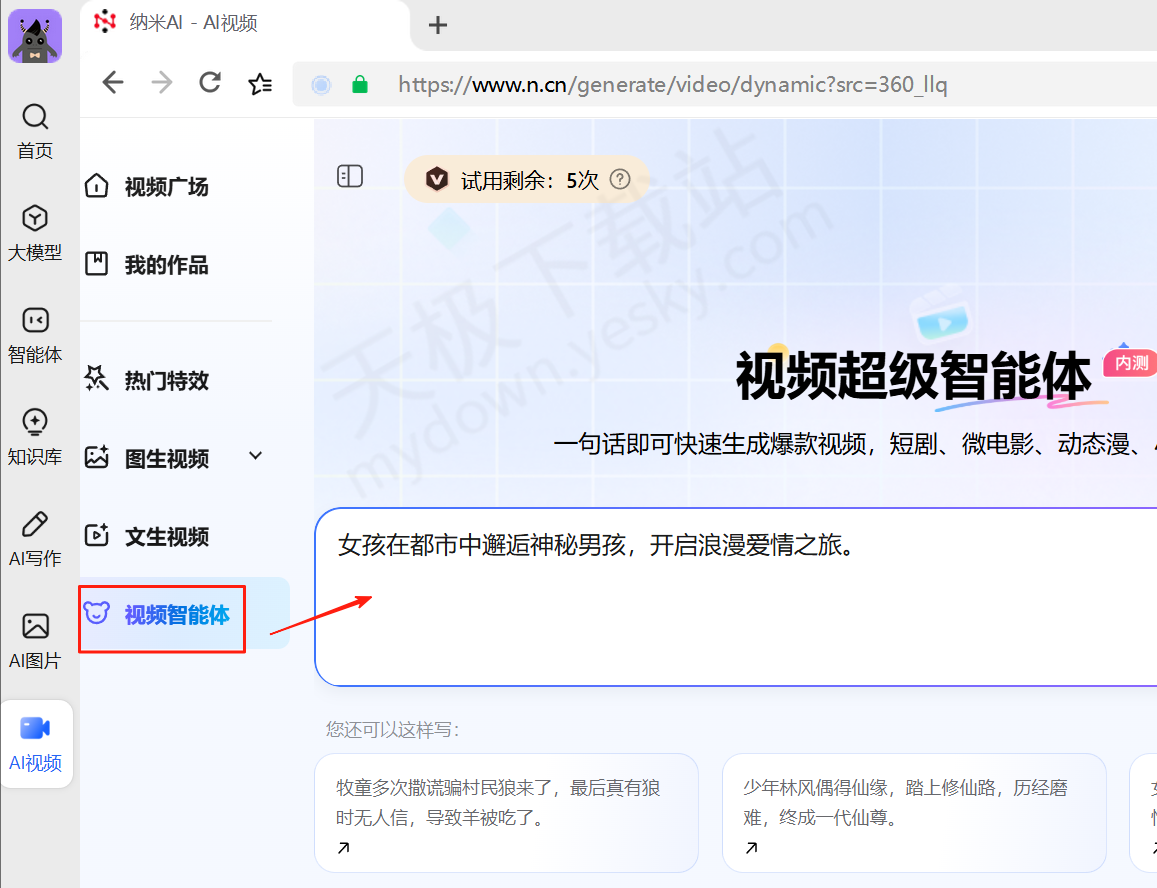 纳米AI视频智能体是纳米AI新推出的一款智能视频制作工具,可用于生成爆款视频、短剧、微电影、动态漫等内容。它能根据用户输入的主题、关键词或简单描述,自动完成从内容构思到视频成品输出的全流程工作,同时,用户也可以参与进来,对故事走向、视频风格、配音等进行个性化设置。