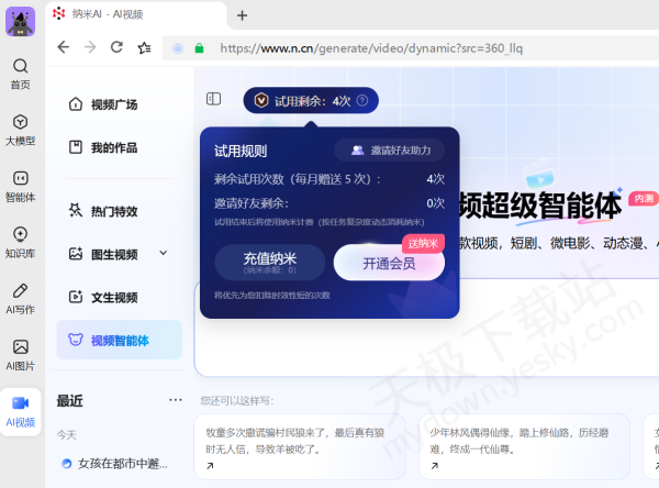 经实测,纳米AI电脑版视频智能体是需要付费使用的。该智能体为每位用户提供5次免费使用机会,免费次数用完后,需消耗纳米点数继续使用。关于纳米点数,每位用户注册后可获得100个,不过这些点数有7天的使用期限。若限时点数用完,就需要付费购买才能继续获取点数并使用智能体功能。