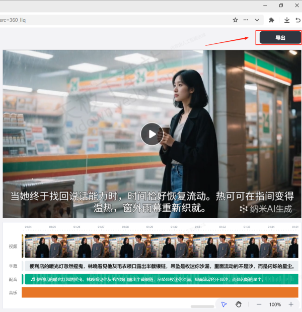 6.等待AI视频制作完成后,我们可以进行预览,下方可对视频的长度、配乐等进行编辑,全部完成后,点击上方【导出】即可。