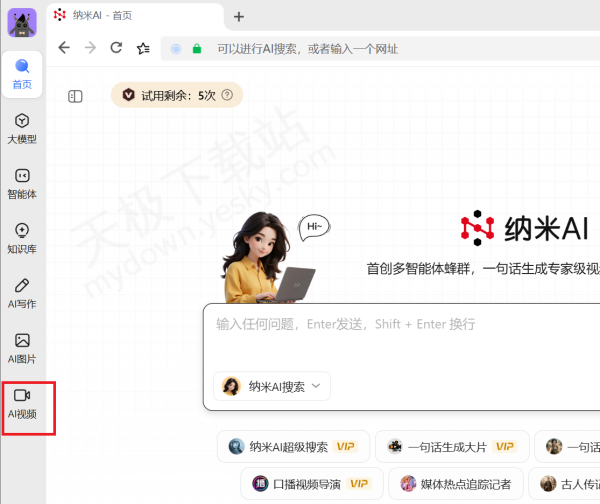 1.下载并打最新版本的纳米AI电脑版,登录账号,点击左侧【AI视频】。