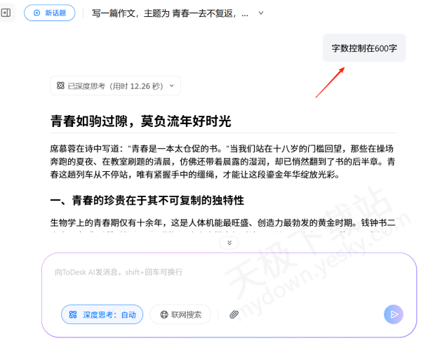 经调查,ToDesk的AI写作工具真的非常好用,它内置了丰富的应用场景提示词模板,涵盖作文、周报、方案策划、宣传文案、总结汇报等多种常见需求场景,用户无需自行构思复杂提示词,只需根据所选模板填写关键信息,就能轻松生成内容;且生成的文章逻辑清晰、语句通顺,既能满足日常办公、学习中的基础写作需求,也可在此基础上稍作调整优化,大幅降低了写作门槛,节省了创作时间。