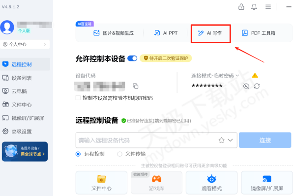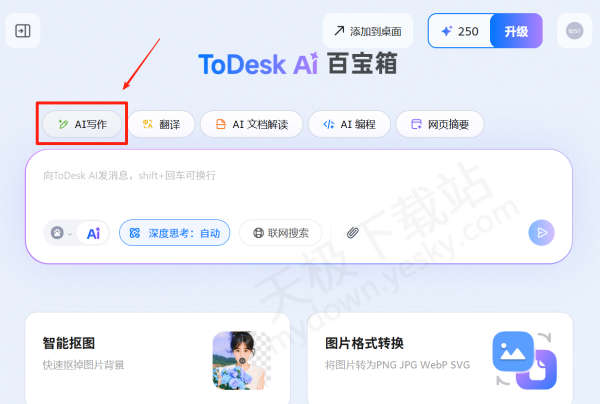 1.下载并打开最新版本的ToDesk电脑版,然后点击首页上方【AI写作】选项。