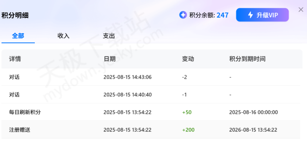 经实测,ToDesk的AI写作工具是需要付费使用的,每使用一次AI写作工具,就需要消耗1点积分,通过对话对已有内容进行整改则每次消耗2点积分;积分获取方面,用户每日会自动刷新50点,有效期仅至当天24:00,而新用户注册时可直接获得200点积分,其有效期长达1年。