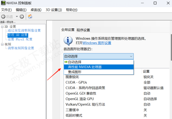 4.将被控端显卡切换至更高性能显卡,打开NIVIDA控制面板,找到【图形处理器】,选择【高性能NIVIDA处理器】,然后重启软件。