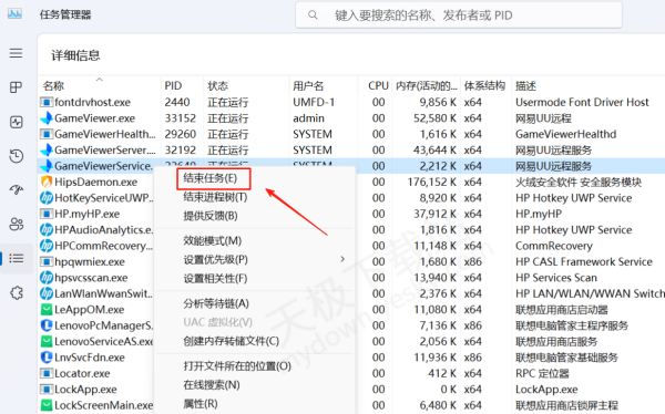 3.在任务管理器的【详细信息】内结束并重启GameViewerService服务。