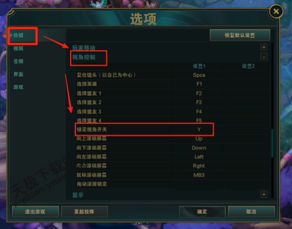 ●如果觉得手指一直按住很麻烦,也可以使用快捷键【Y】,只需点按一次就可以将视角一直锁定。该键位的修改方法为,点击键盘【ESC键】,在【热键】-【视角控制】下方找到【锁定视角开关】,然后就可以进行更改了。