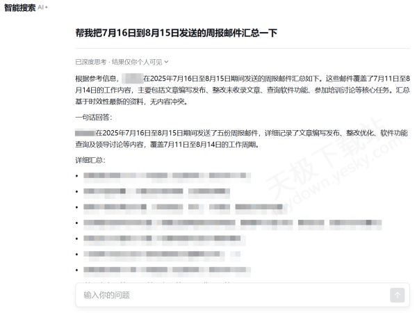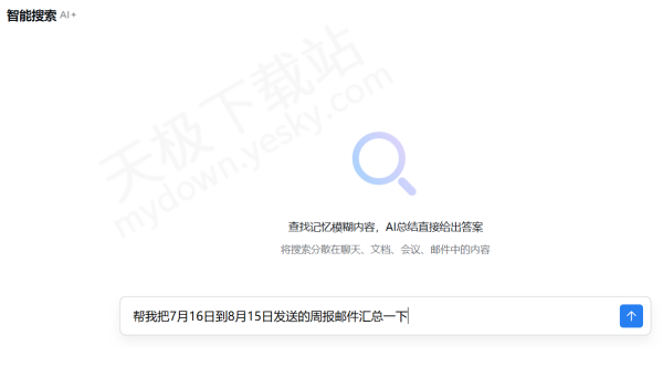 2.输入搜索提示词,比如“帮我汇总一下某段时间的周报邮件内容”,然后发送。