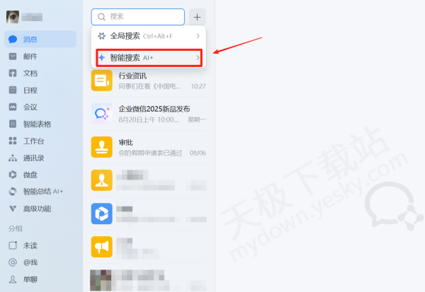 1.下载并打卡最新版本的企业微信,点击上方搜索框,选择【智能搜索】。