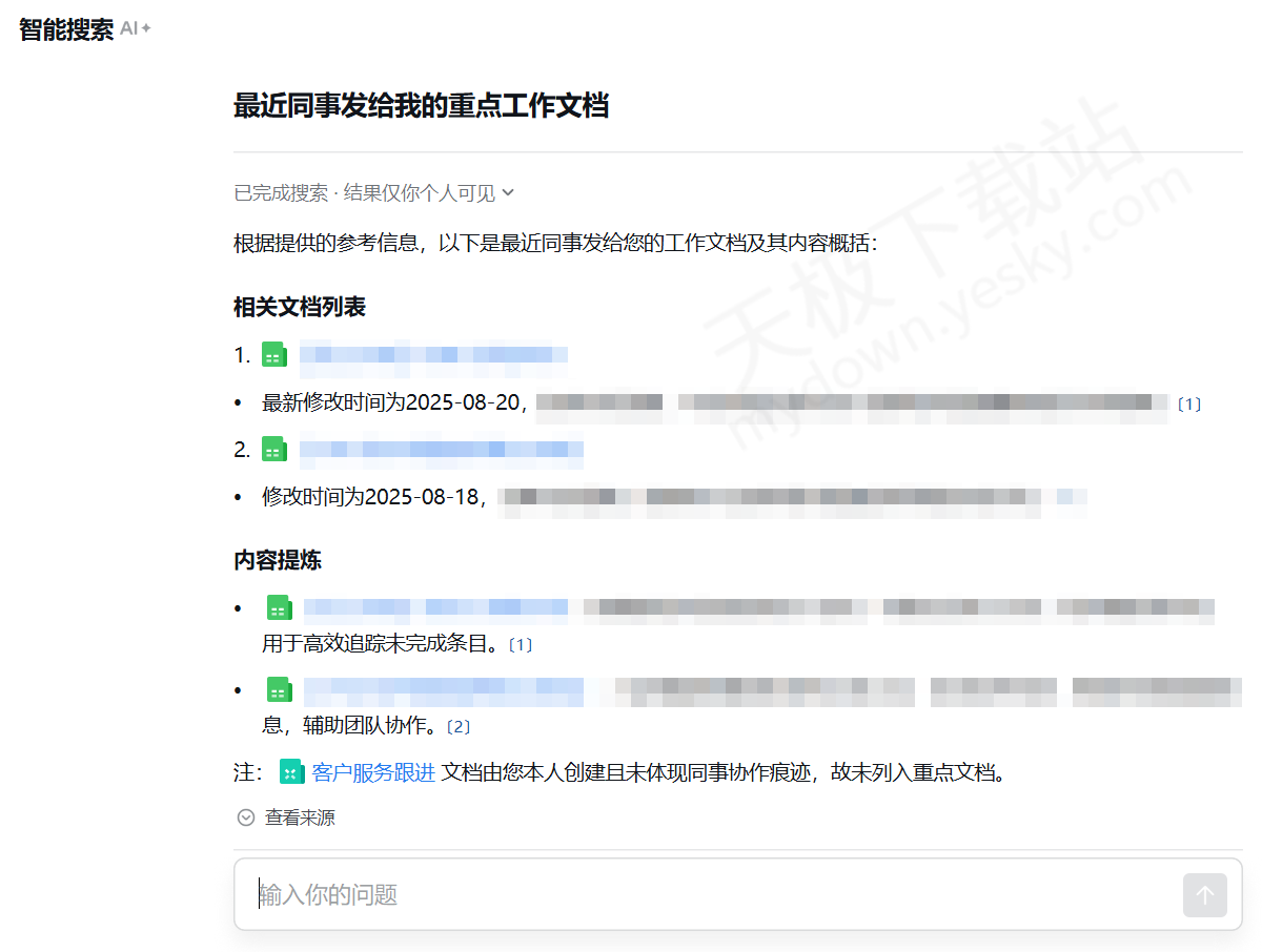经调查,企业微信智能搜索是V5.2.0版本新上线的一种高效信息检索工具,它能够帮助我们快速检索聊天、文档、邮件、会议中内容,根据提示词找出核心信息,比如找出最近谁给我发送了文件、最近开的会议中参会人员都有谁等等,可以降低信息整理成本,提升信息获取效率。