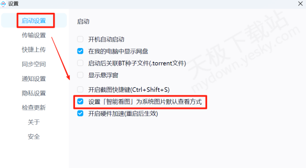 2.点击左上角【启动设置】,勾选右侧【设置“智能看图”为系统图片默认查看方式】。