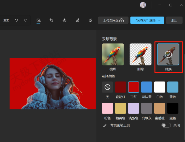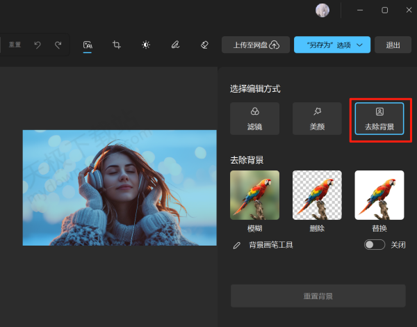 5.在下方选择【删除背景】或【替换背景】,设置完成后点击上方【另存为】保存在本地即可。