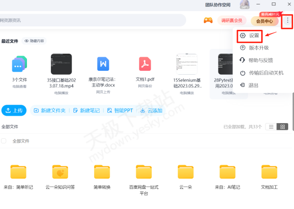 1.下载并打开最新版本的百度网盘,点击首页右上角【三个点】选项,选择【设置】选项。