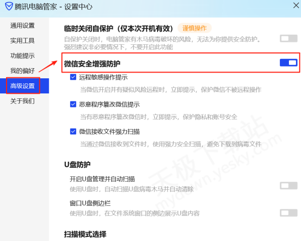 2.点击左侧【高级设置】,在下方找到【微信安全增强防护】选项,将其打开,下方3个选项可根据需要进行勾选。