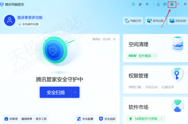 1.下载并打开最新版本的腾讯电脑管家,点击首页右上角【设置】选项。