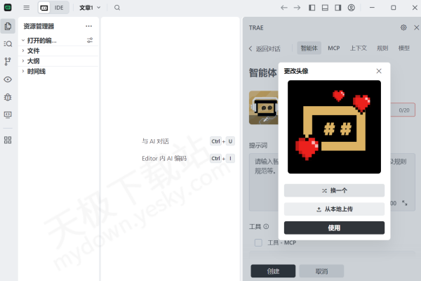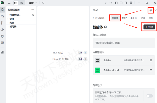 1.下载并打开最新版本的Trae,快捷键【Ctrl+U】调出对话窗口,然后点击右侧【AI功能管理选项】,找到【智能体】点击创建。