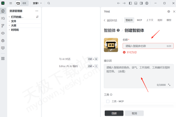 2.输入智能体的名称、提示词,在下方选择MCP配置工具(如果不选,则会使用默认的模型)。