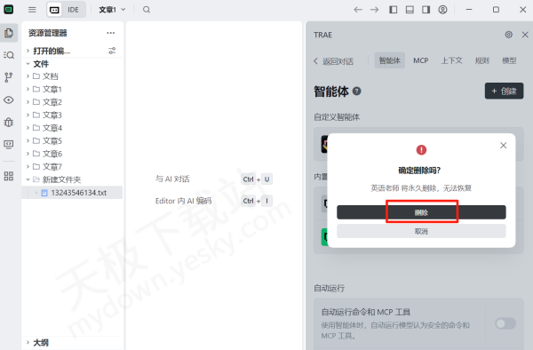 2.智能体删除后永久无法恢复,确认后,在弹窗内点击【删除】即可。