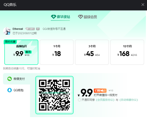 ○连续包月:首月9.9元,原价18元,到期自动续费15元,可自动取消;