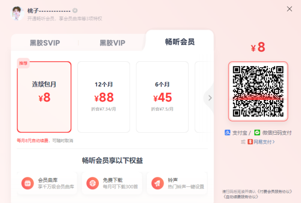 | 畅听会员 | 连续包月 | 8元,每月8元自动续费,可随时取消 |