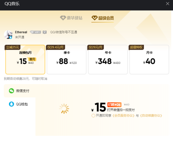| QQ音乐 | 超级会员 | 连续包月 | 首月为15元,原价40元,立减25元,到期自动续费28元,可随时取消 |