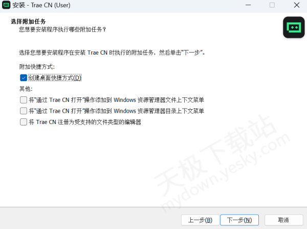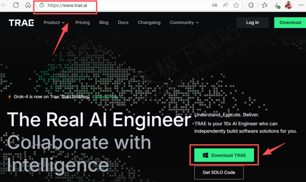 ○打开电脑浏览器,在上方网址框中搜索“trae点ai”,进入Trae国际版官网,点击页面中间【DownLoad TRAE】选项,下载完成后打开安装包进行安装,步骤与中文版安装一致。