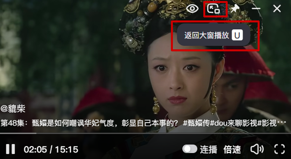 3、点击右上角提示【返回大窗播放】的图标,进入大窗模式。