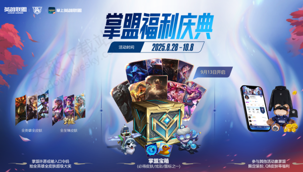 9月13日起,登录掌上英雄联盟完成对局和分享任务,可获得掌盟宝箱,开启后必得皮肤/炫彩/图标之一。此外,完成邀请任务,还可领取14周年掌盟主页装扮及海量QB周边奖励。