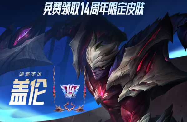 1.周年庆期间,登录账号即可领取“14周年限定皮肤暗裔英雄-盖伦”。