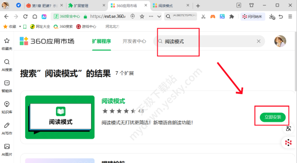 2、跳转到【360应用市场】,搜索【阅读模式】,点击【立即安装】即可。