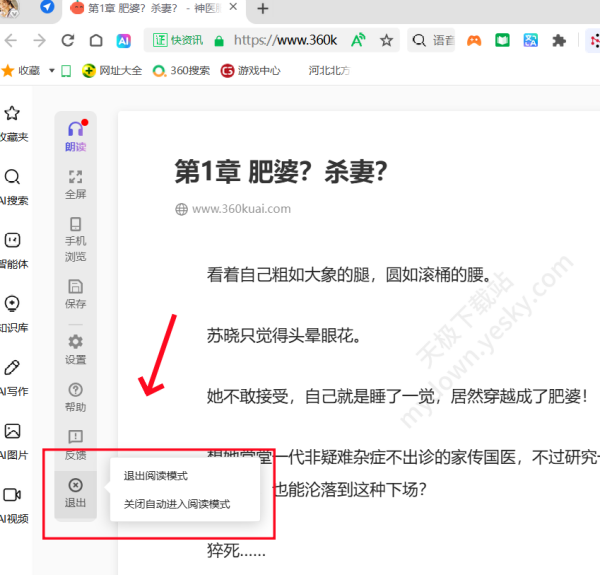 5、点击左下角【退出】,可选择【退出阅读模式】或【关闭自动进入阅读模式】。