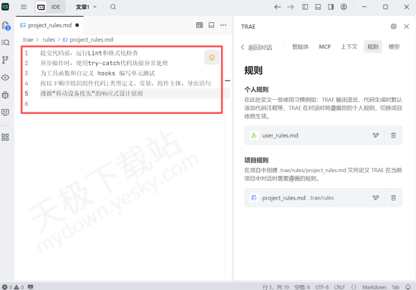 Trae规则配置注意事项1.个人规则要保证配置的语言为中文或英文。Trae的个人规则仅支持中文与英文两种语言解析规则,若使用其他语言(如法语等),可能导致规则无法识别。