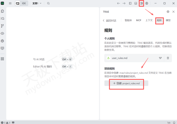 ○依然是点击Trae的首页点击上方【AI侧栏】,点击【AI功能管理】选项,选择【规则】,在项目规则下方点击【创建 project_rules.md】。