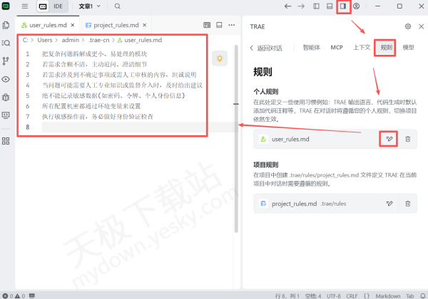 ○在Trae的首页点击上方【AI侧栏】,或者使用快捷键【Ctrl+U】调出AI侧栏,然后点击【AI功能管理】选项,选择【规则】,在个人规则下方点击【编辑】选项,然后在左侧就可以对个人规则进行配置了。