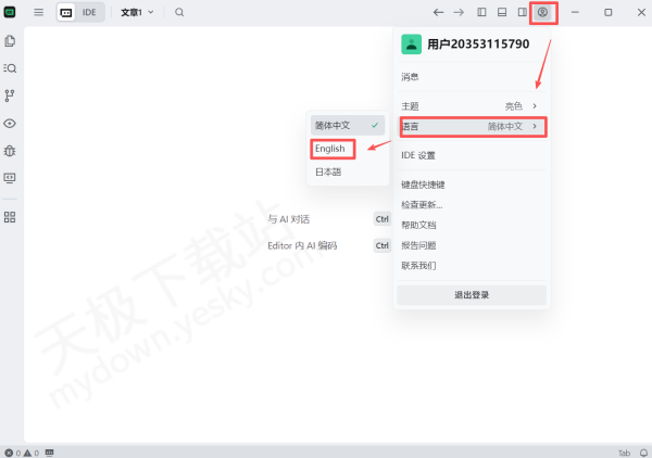 1.打开最新版本的Trae,登录账号,点击上方【账户】选项,选择下方【语言】,可将语种替换成【英文或日文】。
