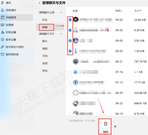 3.选择页面左侧的【群聊】,然后在右侧勾选,最后点击下方【删除】选项即可。