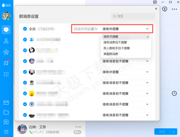 2.在左侧勾选需要管理的群聊,然后在右上角统一设置群聊提醒。