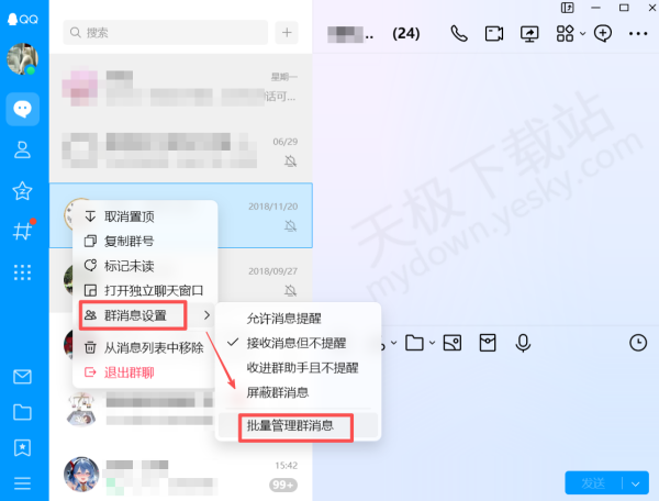 1.打开最新版本的QQ,右键一个群聊的窗口,选择【群消息设置】-【批量管理群消息】。