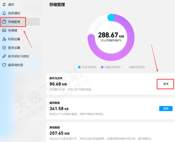 2.选择左侧【存储管理】,在右侧“聊天与文件”处,点击【管理】选项。