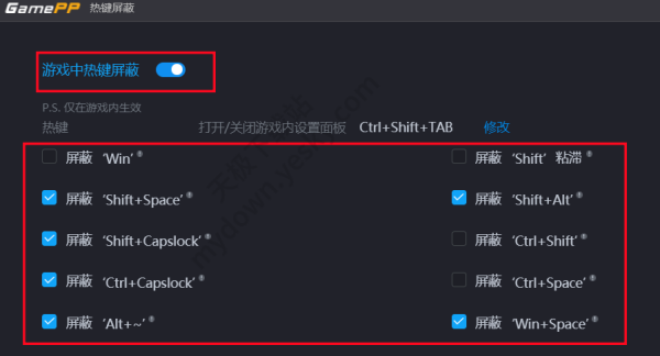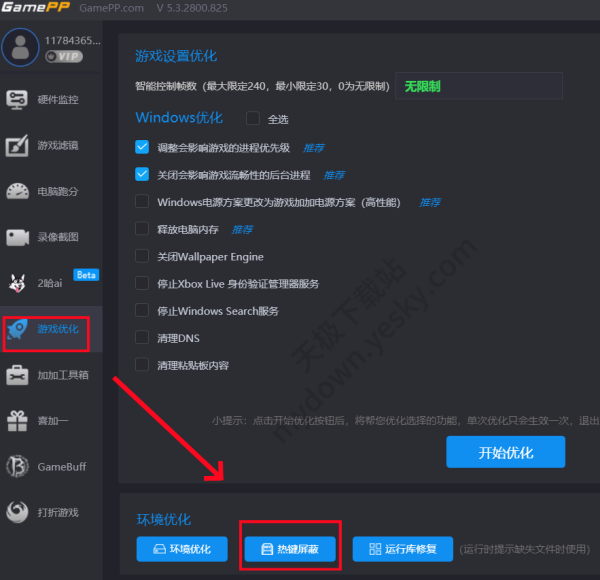 3、点击主页面【游戏优化】→【热键屏蔽】→【游戏中热键屏蔽】可以解决部分冲突问题。