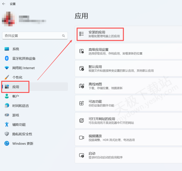●进入电脑设置面板,点击左侧【应用】,选择右上角【安装的应用】。