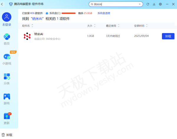 ●比如我们打开腾讯电脑管家,进入软件市场,找到纳米AI,点击【卸载】即可。