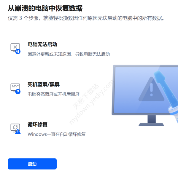 此外,软件还提供崩溃电脑救援功能,即使系统无法启动、出现蓝屏/黑屏或陷入循环修复状态,用户仍可恢复重要数据,无需拆盘或重构,极大提升了数据恢复的便捷性和可靠性。该软件操作简便、恢复成功率极高,是一款非常好用的数据恢复工具。