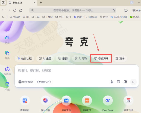 1.下载并打开最新版本的夸克浏览器,点击页面中间的【夸克PPT】。