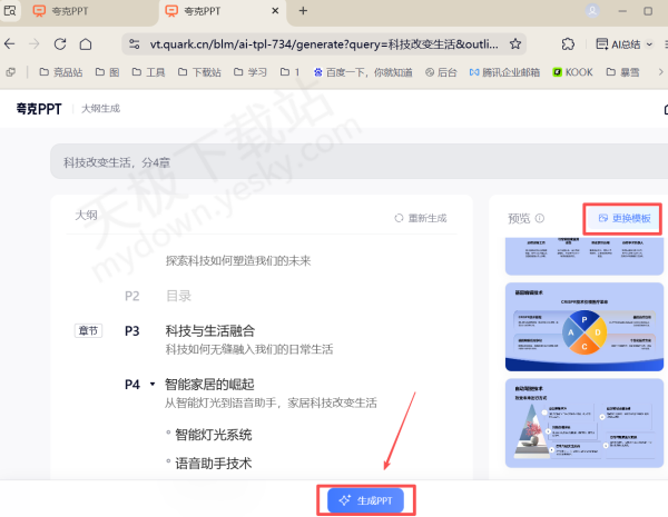 3.夸克会生成大纲,我们可以对其进行编辑,右侧还可预览PPT模板。