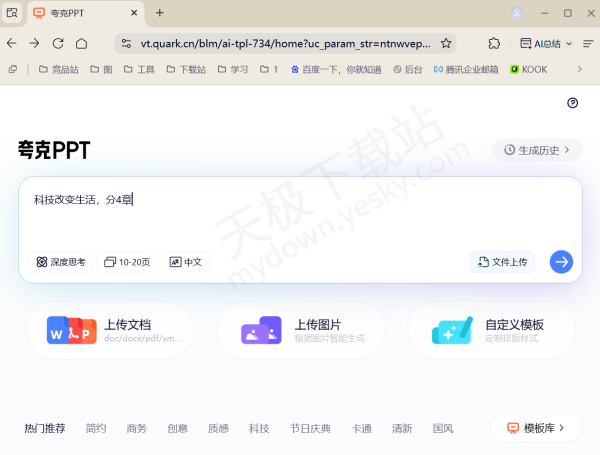 经实测,夸克浏览器AIPPT工具真的超级好用,无需复杂操作,输入主题即可启动创作,页数可按需调整,还能根据需求选择中文或英文生成。此外,它不仅支持文字生成PPT,还能将文档、图片转化为PPT,再加上海量现成模板辅助,新手也能快速做出完整PPT。