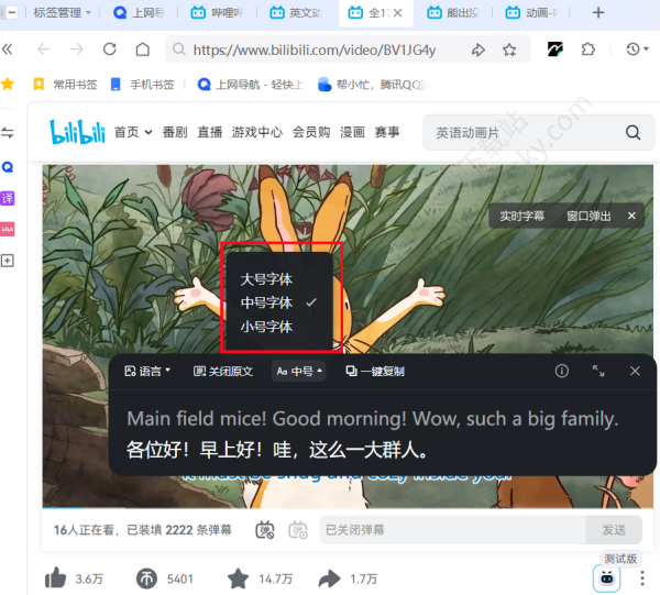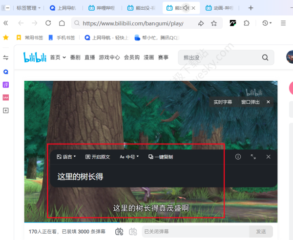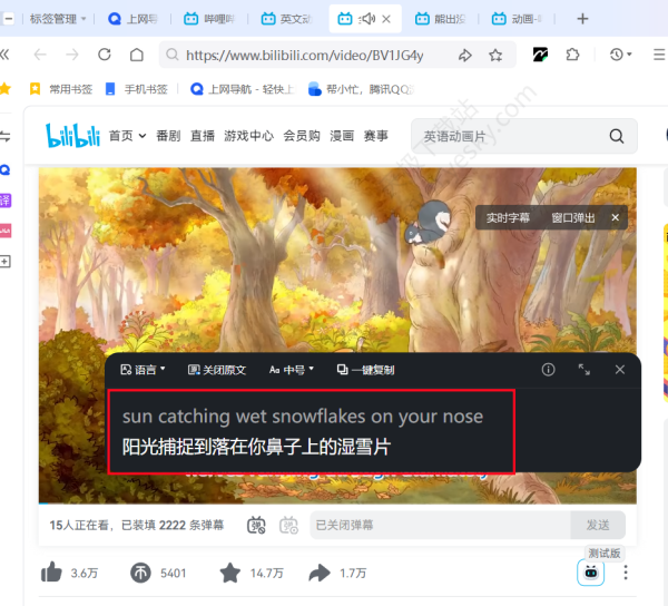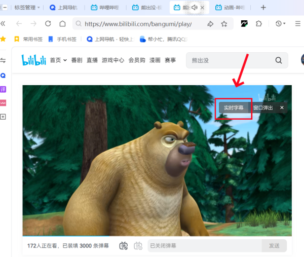 2、进入任意视频网站,在视频播放时将鼠标悬停在视频窗口,出现【实时字幕】按钮时直接点击,即可进入实时字幕功能。