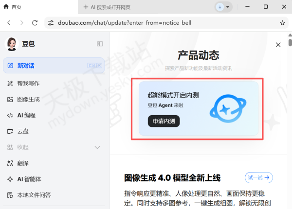 1.下载并打开最新版本的豆包,在首页点击右侧【产品更新动态】选项。