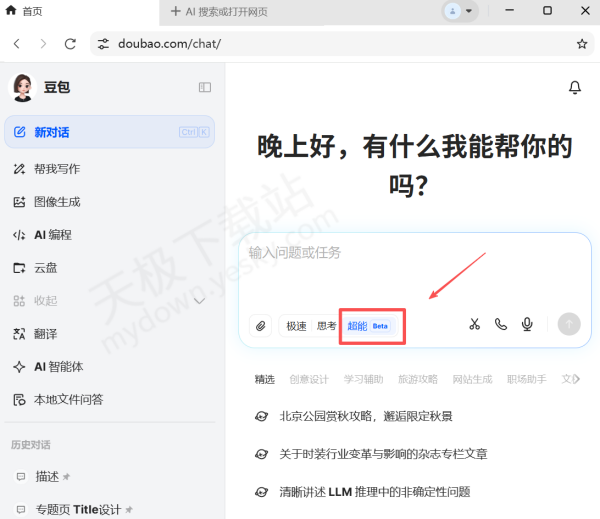 3.申请成功后,豆包会第一时间通知你,之后我们在豆包的【新对话】页面,对话框出现了【超能Beta】选项,我们后续对话需要勾选此选项。