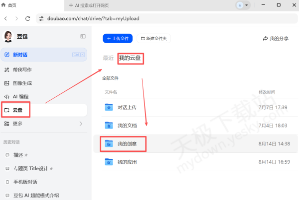 3.我们也可以点击首页左侧【云盘】,然后选择【我的云盘】-【我的创意】,也可以找到之前生成的AI图像。