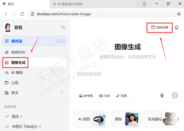 1.打开豆包客户端,点击左侧【图像生成】,在右侧点击【我的创意】。